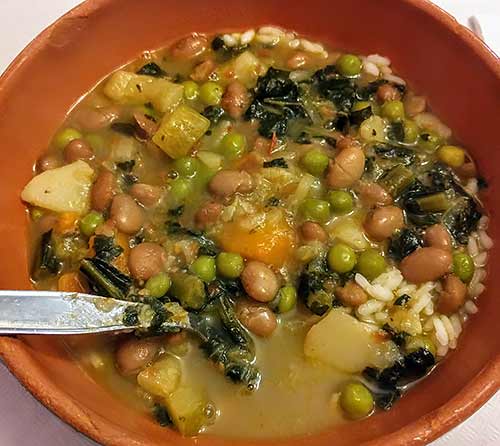While it is interesting to listen to folks debate the “real” recipe for minestrone, in fact making it is more of a process. It uses available seasonal ingredients. So, no, it doesn’t have to have pasta or potatoes in it, even if your mom made it that way. Each cook makes a different version at different times, so the variations are pretty endless.